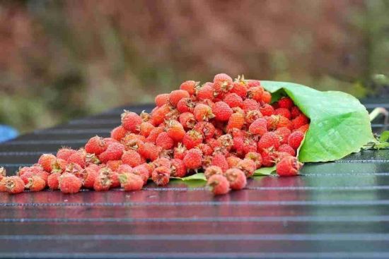 纯天然、野生、绿色、无污染山野菜水果,山上山下,溪边河边,田间地头,随处可采,丰富多样,琳琅满目,诸如,山野蕨菜、野山笋、野山胡葱(薤白)、刺嫩芽、香椿芽、野芹菜、鸭脚板、折耳根、地米菜、地衣菜(地皮菜)、野冻菌、三月泡(山莓、树莓、栽秧泡儿)、茶苞、茶片(耳)等。