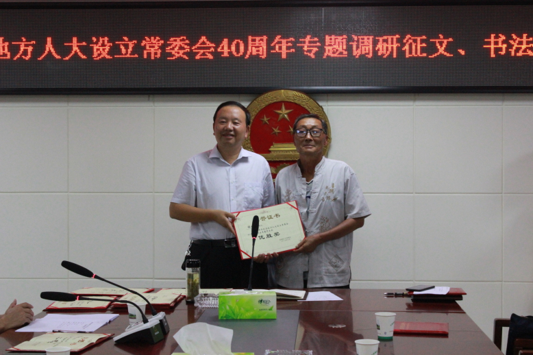本次竞赛历时三个多月,共收征文19篇、书法作品34幅,各位参赛者围绕“纪念地方人大设立常委会40周年”主题,精心写作、创作,用对地方人大设立常委会以来的切身感受抒写文章、挥毫泼墨,展示了写作才能和书法功底。经评委会评选,共有14篇征文作品、15幅书法作品分别获得一二三等奖和优胜奖。向治学主任为获奖者颁发了证书和奖金。