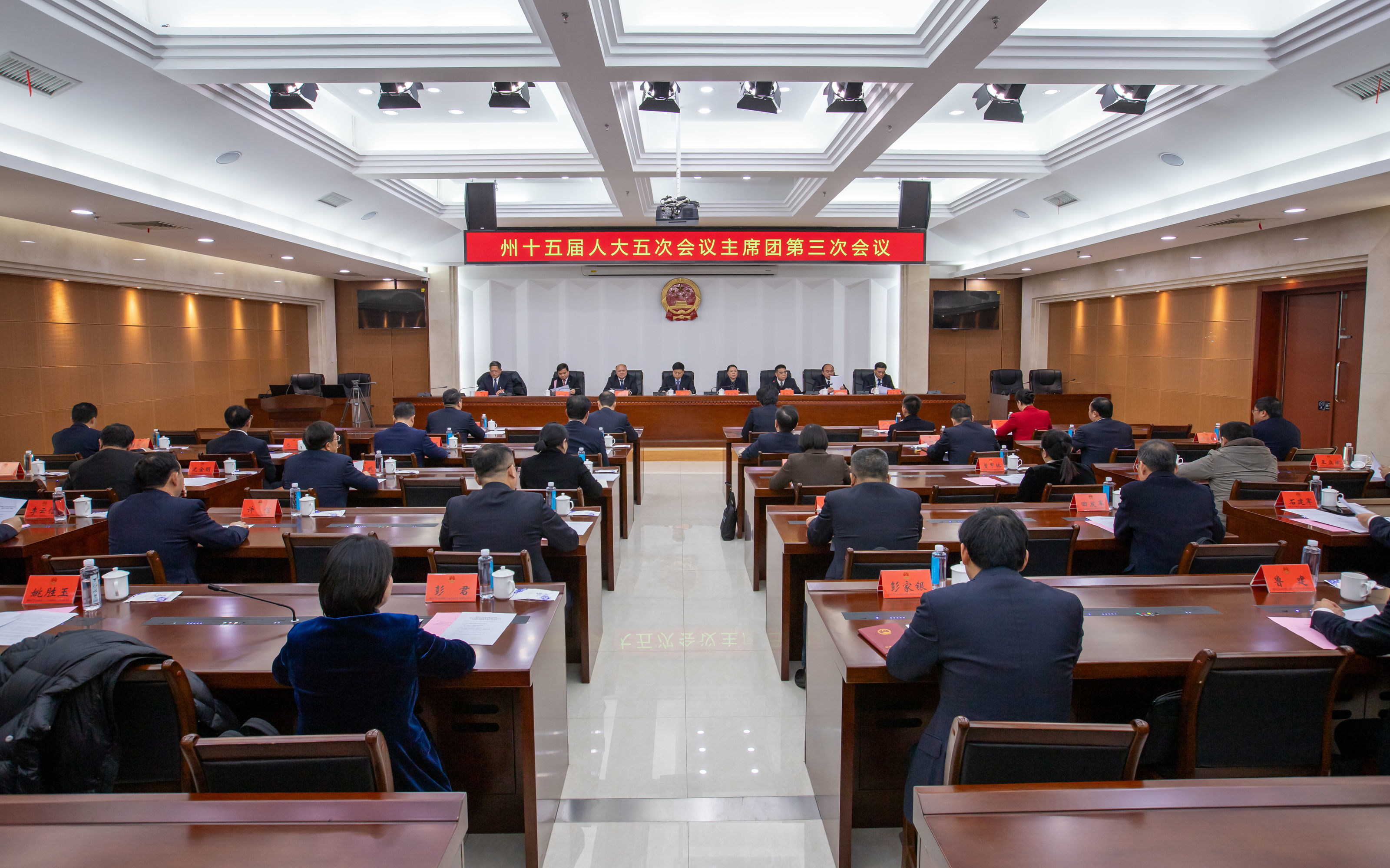 2月10日,州十五届人大五次会议主席团举行第三次会议。主席团第三次会议由大会主席团常务主席胡恩平同志主持。本次会议应到45人,请假1人,实到44人,符合会议法定人数。