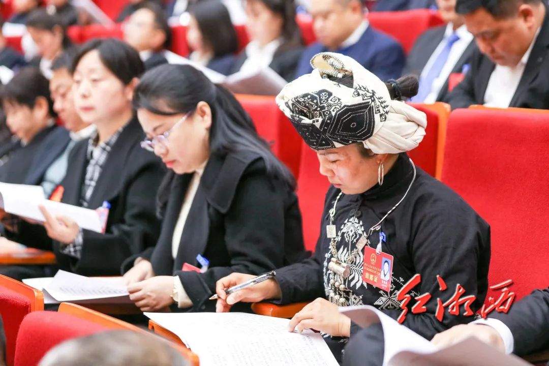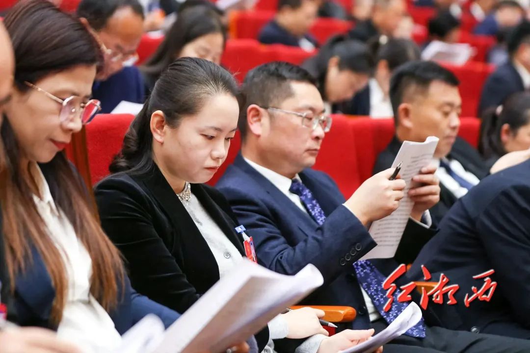 州人大代表们认真审阅政府工作报告。团结报全媒体记者 杨贤清 摄