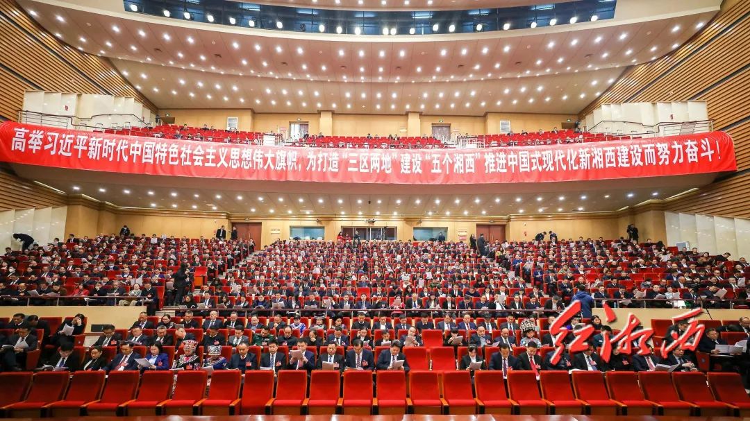 会场布置简朴大方,气氛庄重热烈。“高举习近平新时代中国特色社会主义思想伟大旗帜,为打造‘三区两地’建设‘五个湘西’推进中国式现代化新湘西建设而努力奋斗!”的横幅标语悬挂在会场上方,振奋人心,催人奋进。